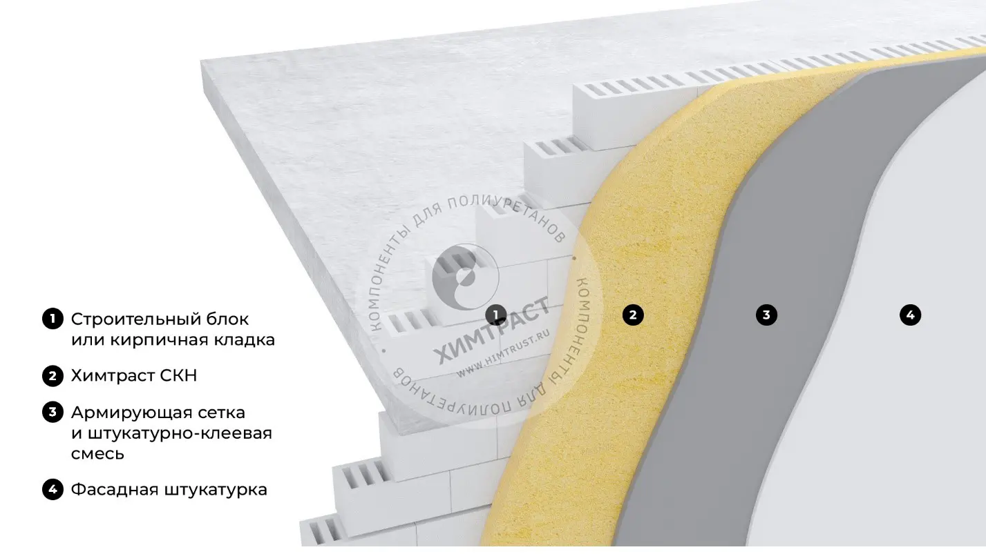 Для утепления стен в зданиях с вентилируемым фасадом или фасадом из сайдинга используется двухкомпонентная система для производства закрытоячеистх жестких пенополиуретанов: